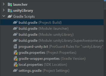 allprojects { buildscript { repositories { mavenCentral() google() jcenter() } dependencies { // If you are changing the Android Gradle Plugin version, make sure it is compatible with the Gradle version preinstalled with Unity // See which Gradle version is preinstalled with Unity here https://docs.unity3d.com/Manual/android-gradle-overview.html // See official Gradle and Android Gradle Plugin compatibility table here https://developer.android.com/studio/releases/gradle-plugin#updating-gradle // To specify a custom Gradle version in Unity, go do "Preferences > External Tools", uncheck "Gradle Installed with Unity (recommended)" and specify a path to a custom Gradle version classpath 'com.android.tools.build:gradle:4.0.1' classpath 'org.jetbrains.kotlin:kotlin-gradle-plugin:1.6.20' } } repositories { mavenCentral() google() jcenter() flatDir { dirs "${project(':unityLibrary').projectDir}/libs" } } } task clean(type: Delete) { delete rootProject.buildDir } - Open the build.gradle(Module :launcher) file